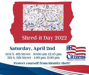 Come see us on the 2nd of April for our FREE SHRED DAY! We will offer shred services at both Leavenworth locations. Take some time to clean out and clear out those old documents and we will be sure to dispose of them properly. All documents are shred on site as you drop them off. See you on April 2nd!